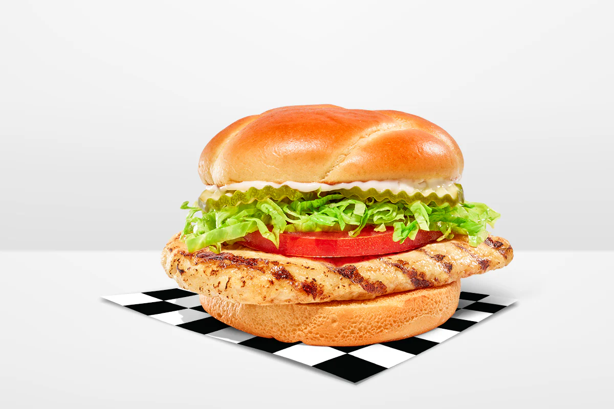 Garlic Swiss grilled Chicken Sandwich is made with our all white-meat grilled chicken topped with Swiss cheese, crispy onion and garlic mayo all served on a toasted, bakery-style bun.